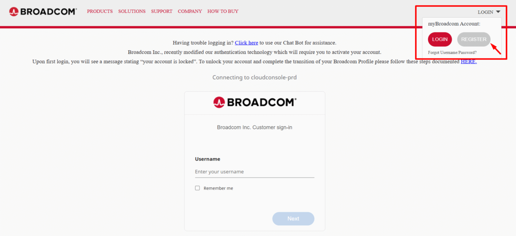 Step 2: You will be redirected to the Broadcom website page. Click on “Register”.